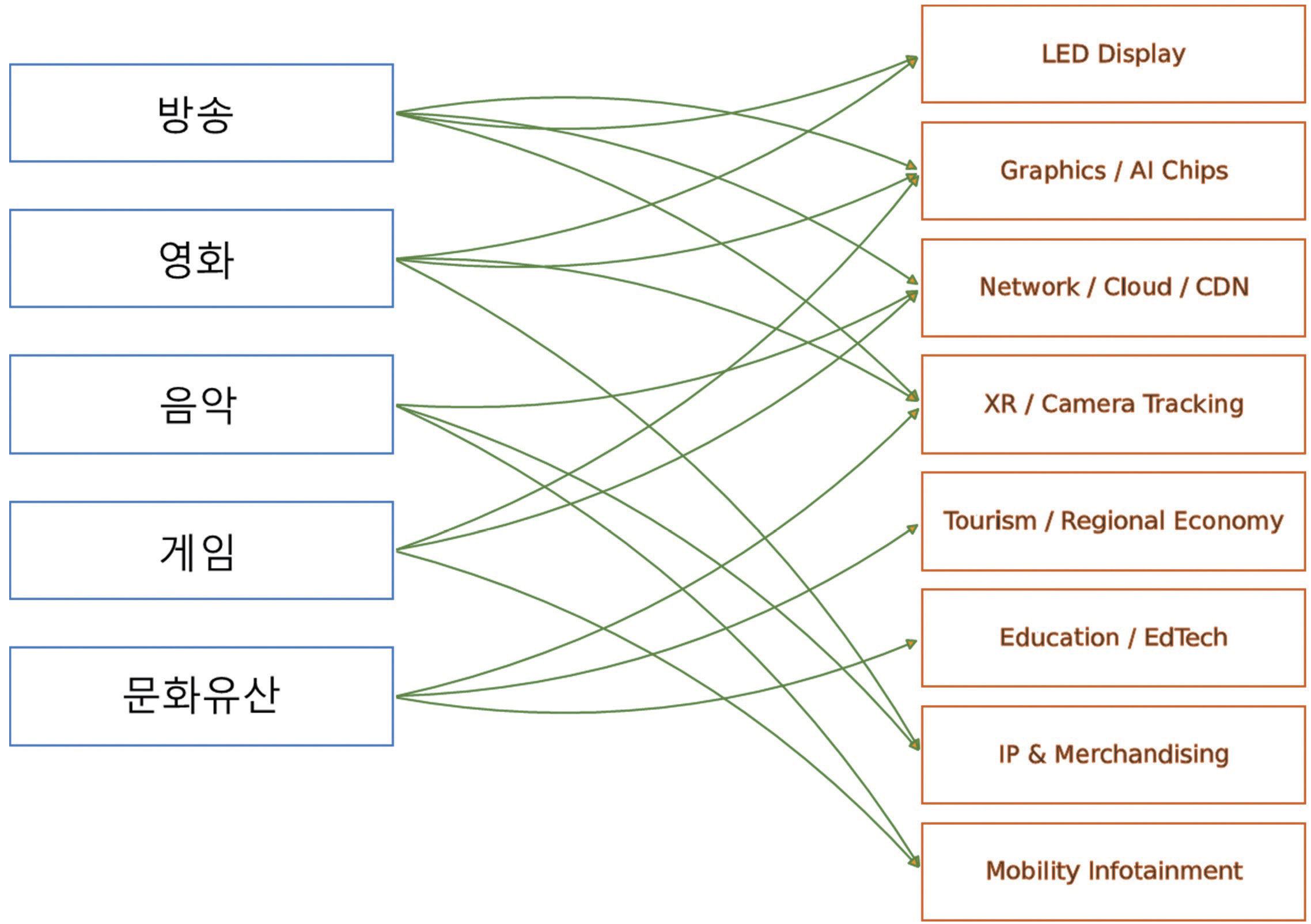 여기에는 두 가지의 큰 흐름이 있다. 첫째, 도구의 변화다. 오늘의 현장에서는 AI가 기획·편집·합성·보정·배포까지 동행하며, 텍스트로 영상을, 허밍으로 곡을, 스케치로 콘셉트 아트를 만든다. 둘째, 구조의 변화다. 가상 프로덕션에는 LED 디스플레이·그래픽용 반도체·초저지연 네트워크가 결합되고, 음악·게임 서비스에는 클라우드·데이터 표준·정산 체계가 얽힌다. 즉, 문화 기술은 창작의 도구이자 산업의 플랫폼이며, 콘텐츠는 단순한 창작이 아닌 제조·통신·플랫폼을 잇는 수요 허브로 진화하고 있다. (그림 2)