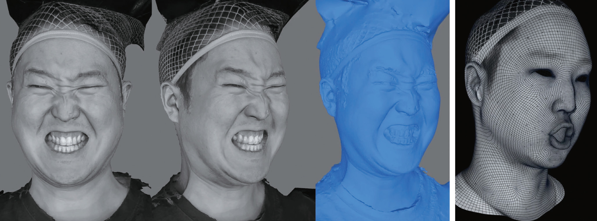 AI 기반 인물 리에이징(Re-aging) 예페이셜 리깅(Facial Rigging)의 경우 같은 표정을 짓더라도 근육의 움직임이나 주름의 모양 등이 모두 다르므로, 배우의 다양한 표정을 3D 스캔하여 해당 데이터를 조합하는 기술이 널리 활용된다. 최근에는 개별 표정뿐만 아니라 3D 스캔을 초당 수십 회 이상 수행해 복잡하게 변화하는 얼굴 움직임까지 연속적으로 획득하는 다이내믹 3D 스캔(또는 4D 스캔)이라는 기술이 각광 받고 있다. Weta Digital과 같은 헐리우드 VFX 스튜디오에서는 디지털 더블 제작을 위해 이미 널리 활용되고 있으나, 우리나라는 일부 연구기관이나 회사에서만 장비를 보유하고 있으며 연구개발도 아직 초기 수준에 머물러 있다. 퍼포먼스 캡처는 몸체와 얼굴 캡처로 나뉘는데, 몸체를 캡처하는 기술은 국내에서도 상용 목적으로 널리 활용되고 있다.