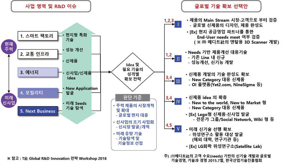T社의 개방형 혁신 Needs와 글로벌 R&D 연계 전략특히, 미래형 신기술 선점과 선행개발을 위한 차세대 사업 분야(그림 2의 에너지, 모빌리티 등)는 북미 R&D센터의 네트워크를 활용하고, 새롭게 유럽(독일, 이탈리아, 영국 등)의 연구소 및 대학과 연계한 위성연구소 운영을 통해 신성장 사업 및 태동기술을 조기에 확보하도록 하였다. 그리고, 그 과정에서 아이디어 확충, 신기술 탐색 및 가능성 검증 등 선행 R&D 활동을 적극 추진하고자 하였다.(그림 1의 A, 그림 2의 Ⅳ·Ⅴ)