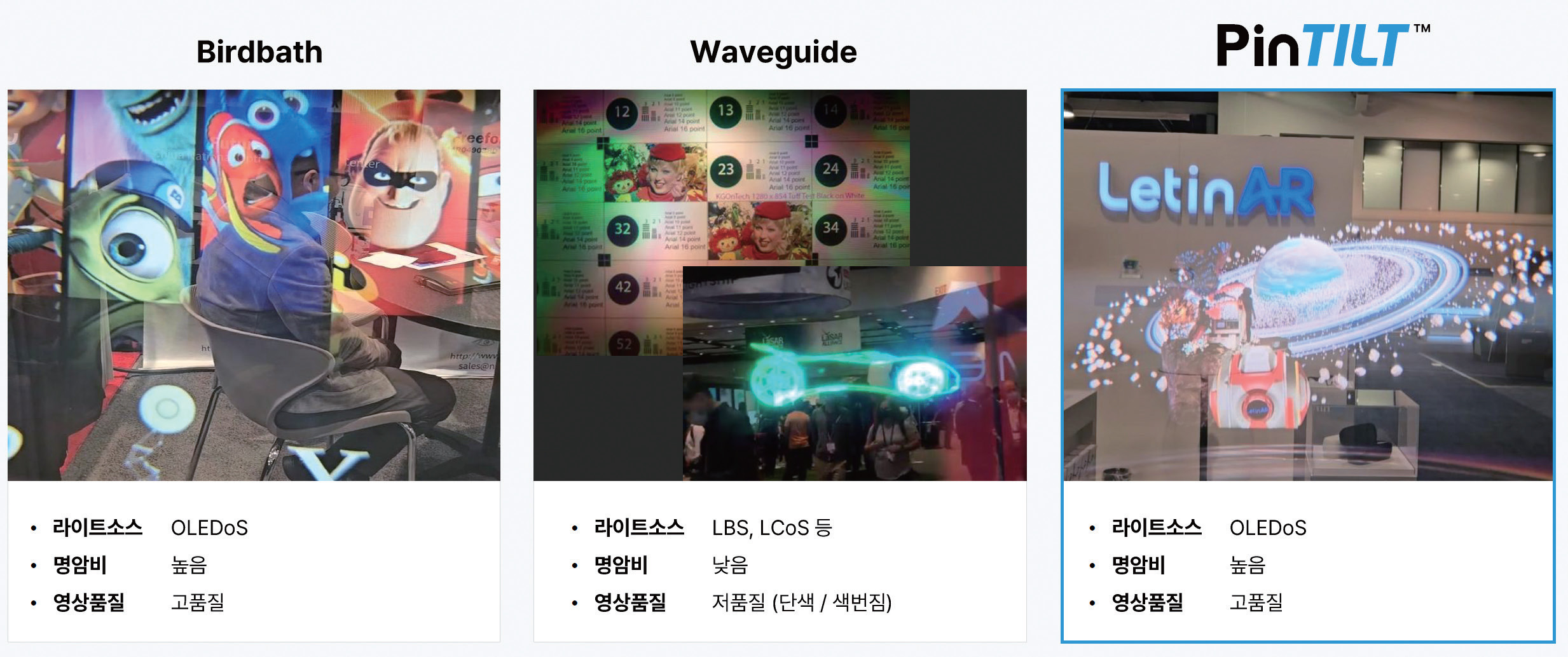 스마트글래스의 시인성 비교(좌측부터 버드배스 방식, 웨이브가이드 방식, 핀 틸트™ 기술)핀 미러TM, 핀 틸트TM 기술 개발 과정