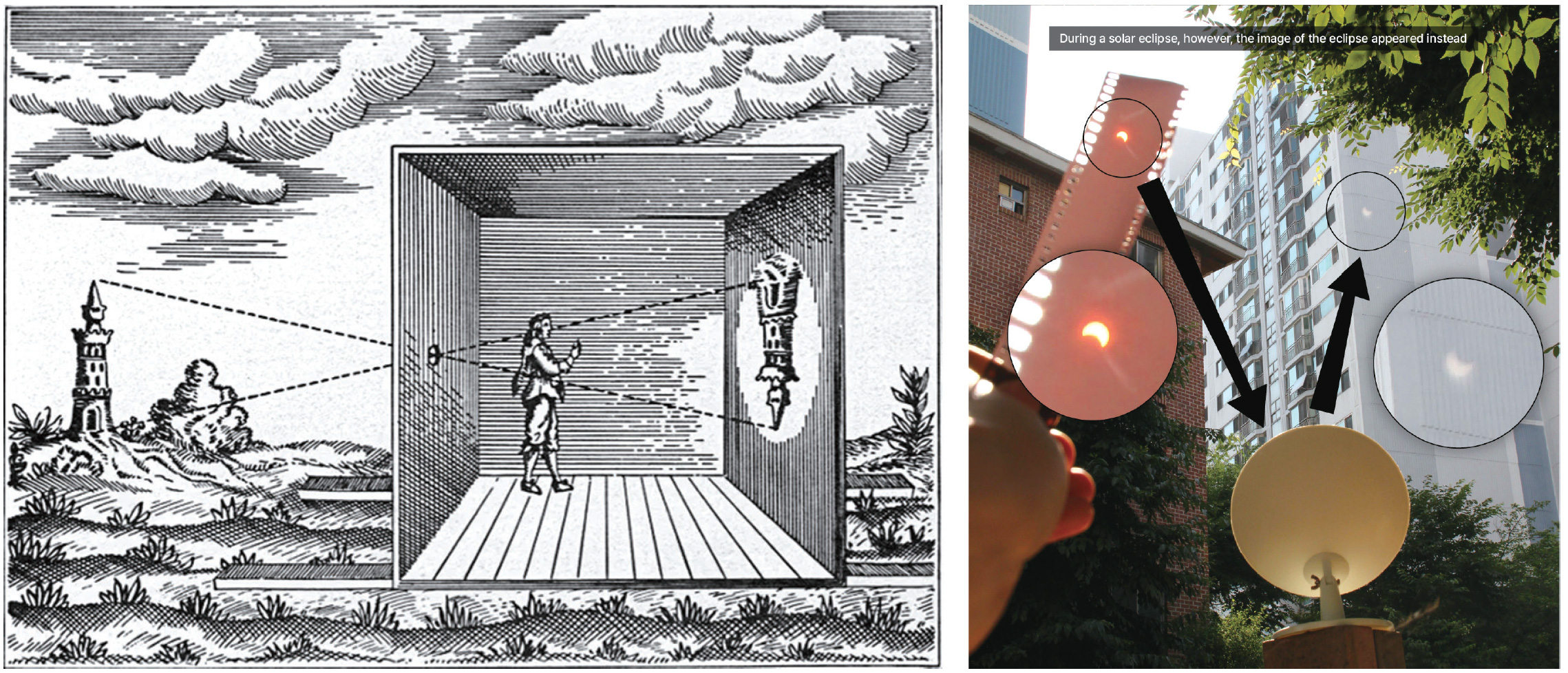 고대 그리스 시대부터 기록된 바늘구멍사진기의 원리 및 2009년 개기일식 당시, 실험 장면