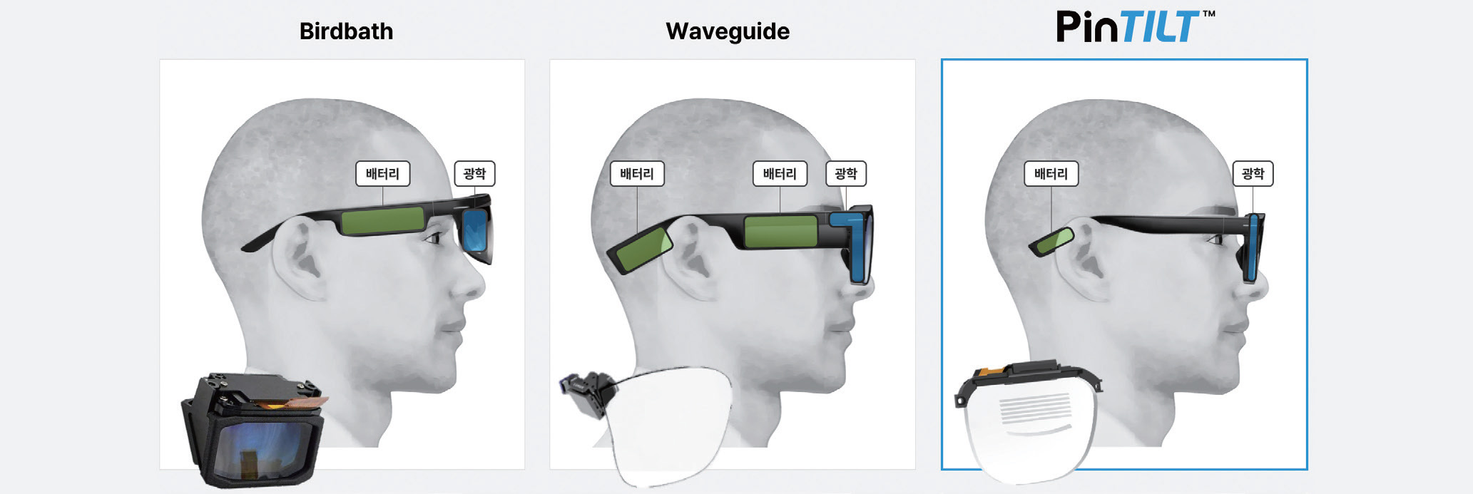 광학 모듈과 전력소모에 따른 안경 형태 (좌측부터 버드배스 방식, 웨이브가이드 방식, 핀 틸트™기술)MINI INTERVIEW