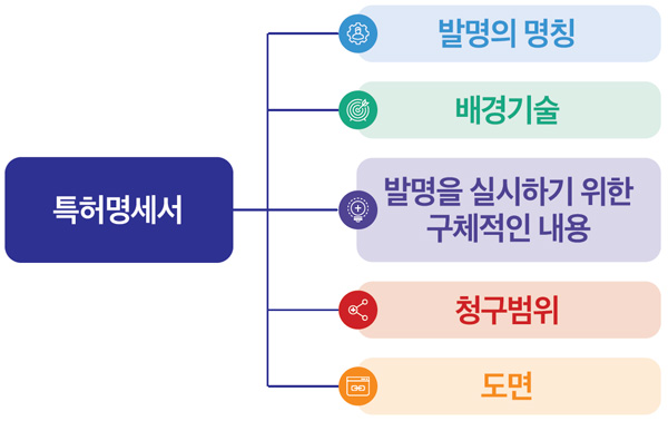 특허 명세서는 발명의 명칭, 배경기술, 발명을 실시하기 위한 구체적인 내용, 도면, 요약, 청구범위 등의 목차로 구성되어 있다. 우선, 요약에는 발명의 주요 기술적 특징 또는 효과가 간략하게 설명된다. 배경기술에는 출원인이 인지하고 있는 종래 기술에 대한 설명이 기재되고, 기존 기술의 한계 또는 문제점 등이 제시된다. 또한, 특허 명세서는 해당 기술분야에서 통상의 지식을 가진 사람이 그 발명을 쉽게 실시할 수 있도록 명확하고 상세하게 기재할 것을 요구하고 있으며, 발명을 실시하기 위한 구체적인 내용에는 발명의 목적ㆍ효과를 달성하기 위한 제품의 구체적 구성, 실제 구현 방법, 실험예ㆍ비교예 등이 기재되어 있다.