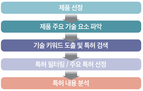 우선, 제품 선정 단계이며, 분석하고자 하는 제품을 명확히 정할 필요가 있다. 제품 선정이 완료되면, 제품의 주요 기술 요소를 파악하여야 한다. 이때, 제품 광고, 사용 매뉴얼, 사용자 리뷰등 제품의 주요 기능ㆍ부품 등이 소개된 자료를 이용할 수 있다. 이와 같이, 파악된 기술 요소를 바탕으로 특허 검색을 위한 기술 키워드를 도출하고 특허 검색을 진행한다. 키워드를 통해 분석하고자 하는 제품의 기술 분야(또는 산업 분야)를 특정하고, 분석 범위를 설정하는 것이 중요하다. 분석 범위 설정 시, 분석대상 국가(한국, 미국, 중국, 일본, 유럽 등)를 설정할 수 있고, 출원 기간(최근 5년, 최근 10년 등)을 설정할 수 있으며, 출원인(경쟁사)을 설정할 수도 있다. 예시로, “회사명 + 기술 키워드”를 조합하는 방법을 추천한다. 특허 데이터는 각 국가별 특허청을 활용할 수도 있고, 특허정보검색 서비스를 활용할 수도 있다. 많은 수의 특허를 특정 조건 내에서 수집하기에는 특허정보검색 서비스를 활용하는 것이 효과적이다. 특허정보검색 서비스는 유ㆍ무료로 제공되며, 대표적으로 특허청에서 무료로 제공하는 키프리스(www.kipris.or.kr)를 활용할 수 있다. 키프리스는 국내 특허ㆍ실용신안뿐만 아니라, 디자인 및 상표의 검색 서비스를 제공하며, 해외 특허의 검색 서비스도 제공하고 있다. 이후, 검색된 다량의 특허 중 제품과 관련된 특허를 선별해내고, 주요 특허를 선정하는 단계를 진행한다.