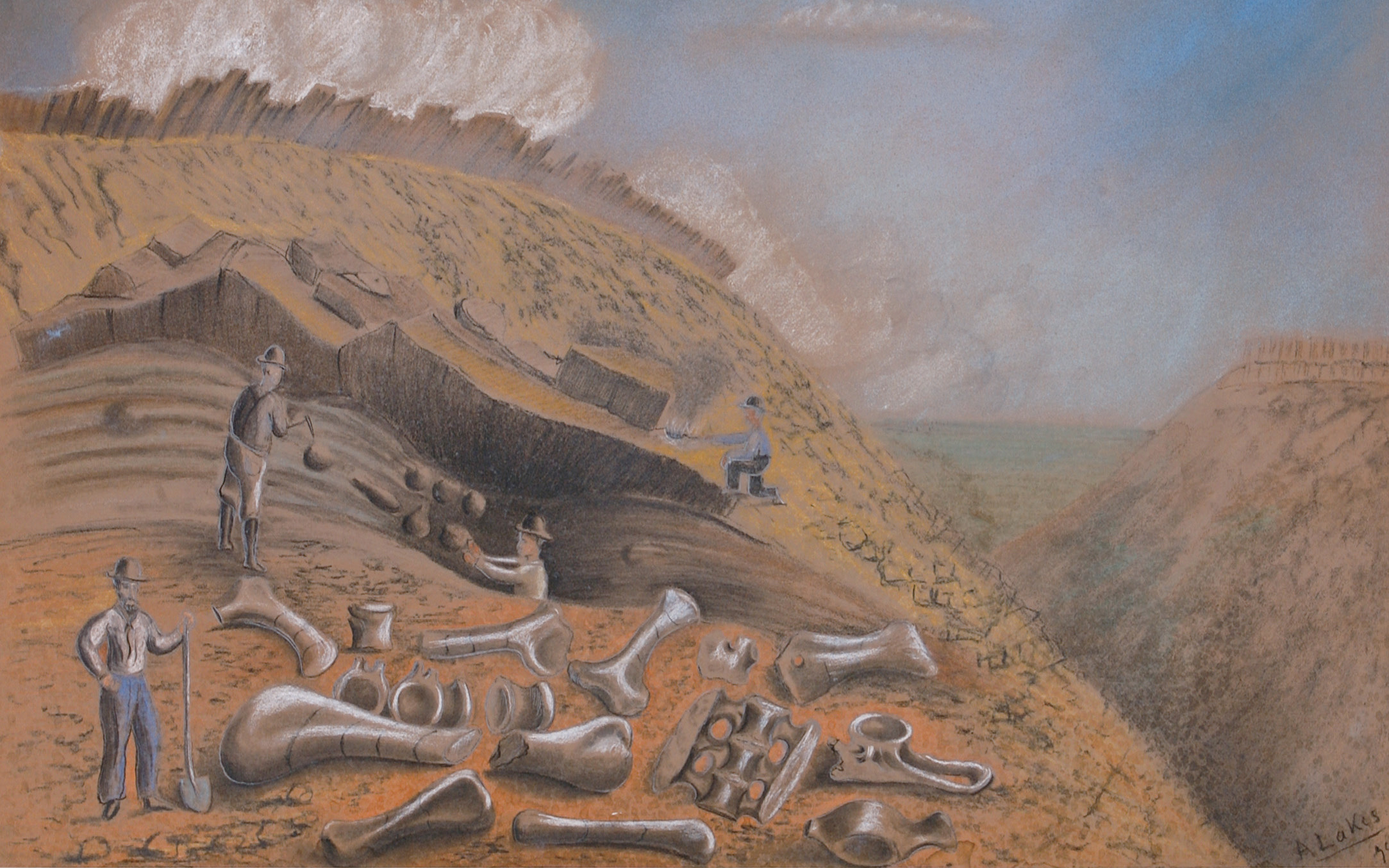 아서 레이크스(Arthur Lakes)가 그린 수채화 〈모리슨에서의 발굴(Digging Out Bones at Morrison)〉. 레이크스는 생애 동안 북아메리카 전역을 탐사하며 여러 차례 고생물학 발굴 현장을 기록한 수채화를 남겼다.