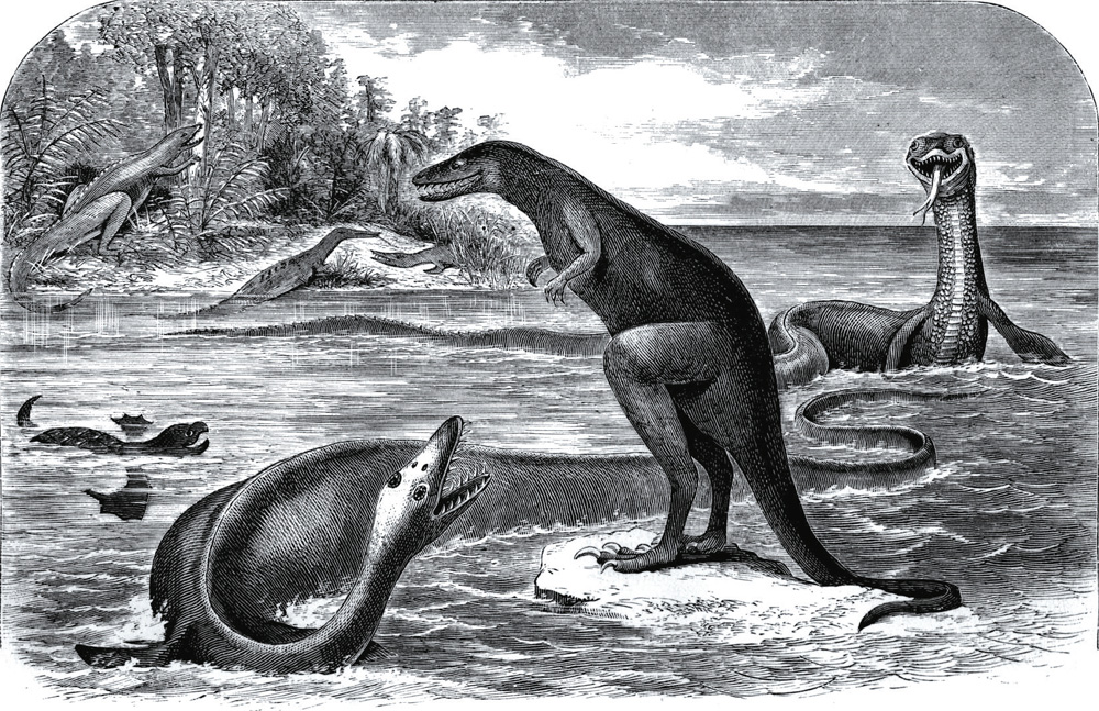 코프가 그린 복원도. 앞쪽에서는 디립토사우루스(Dryptosaurus, 가운데)가 엘라스모사우루스 오리엔탈리스(Elasmosaurus orientalis, 좌하단)와 맞서고 있고, 뒤편에는 모사사우루스(Mosasaurus, 우상단)와 오스테오피기스(Osteopygis, 좌중단)가보인다.